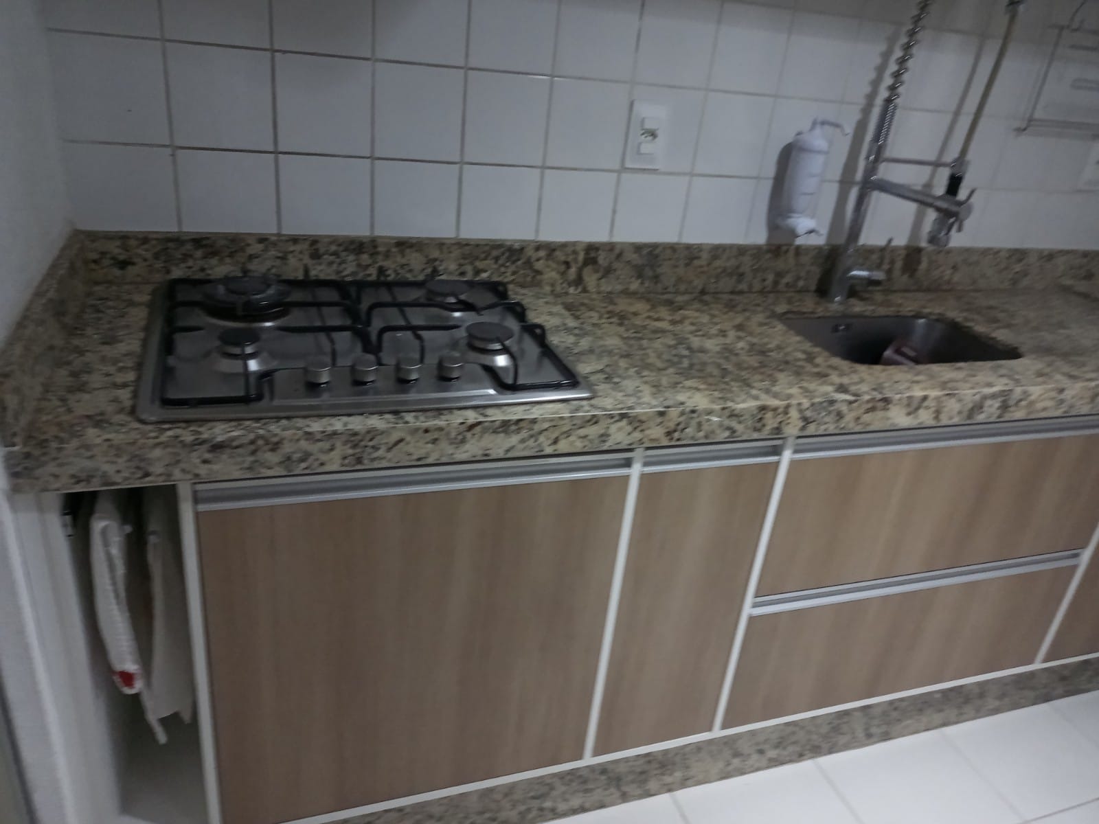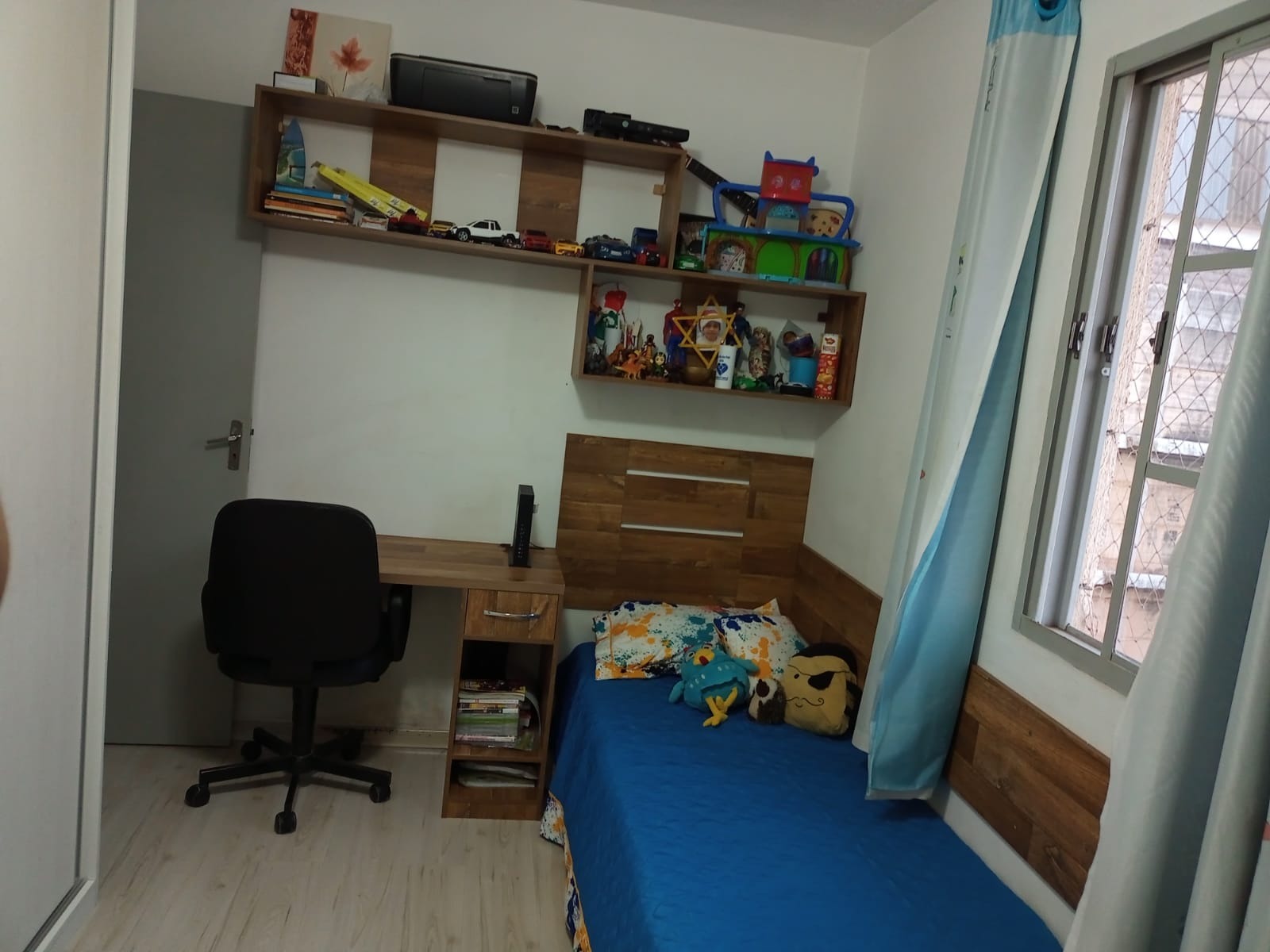 Com 2 dormitórios com piso laminado e armários embutidos, sala com painel, cozinha planejada com cooktop.